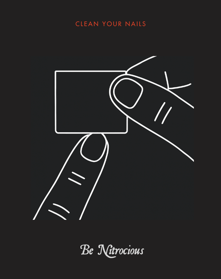 Tämä on ratkaiseva vaihe. Jos kynsissä on öljyjä tai kynsipohja ei ole täysin kuiva, Nitrot eivät tartu. Joten pyyhi puhtaaksi, odota kuivumista ja jatka sitten.