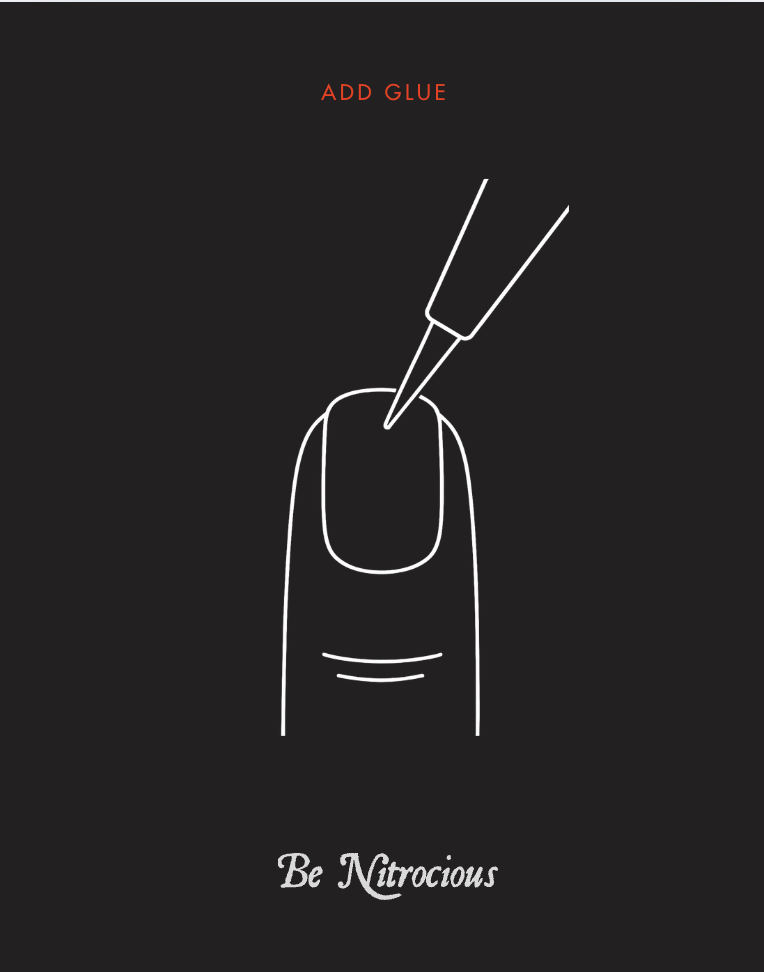 Aloita ensimmäisestä kynnestä (jos olet oikeakätinen, laita Nitrot ensin vasempaan käteen, se on helpompaa). Laita ohut kerros liimaa oman kynnen päälle ja levitä. Lisää sitten hieman kynsiliimaa myös Nitrokynnen sisään.