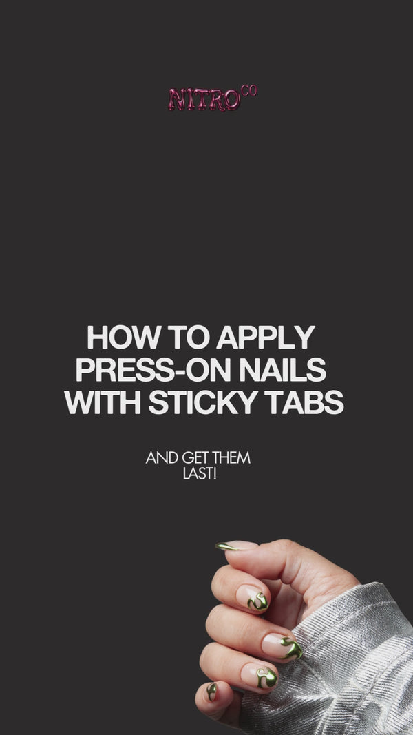 Kun Sticky Tabsin tarrapinnan suojus on poistettu (ja Sticky Tab on nyt ikäänkuin kaksipuolinen teippi), kiinnitä oikeankokoinen Nitrokynsi paikalleen. Aseta kynsi lähelle kynsinauhaa 45 asteen kulmassa ja aseta paikalleen. Paina 20 sekunnin ajan, painele kynttä eri kohdista jotta se tarraa voimakkaasti paikalleen.